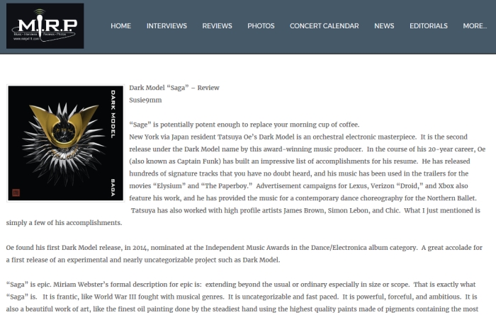 「音楽業界のBBC」とも言われる、英国有力音楽ニュースサイトMusic-News.comでの「Saga」レビューを紹介。「もしあなたが5秒のループとベースのドロップ以上の音楽をエレクトロニック・ミュージックに求めるのであれば、Dark Modelを掘り下げて聴いてみると良い。そこにはあなたが探索すべき全く別の宇宙がある。」
